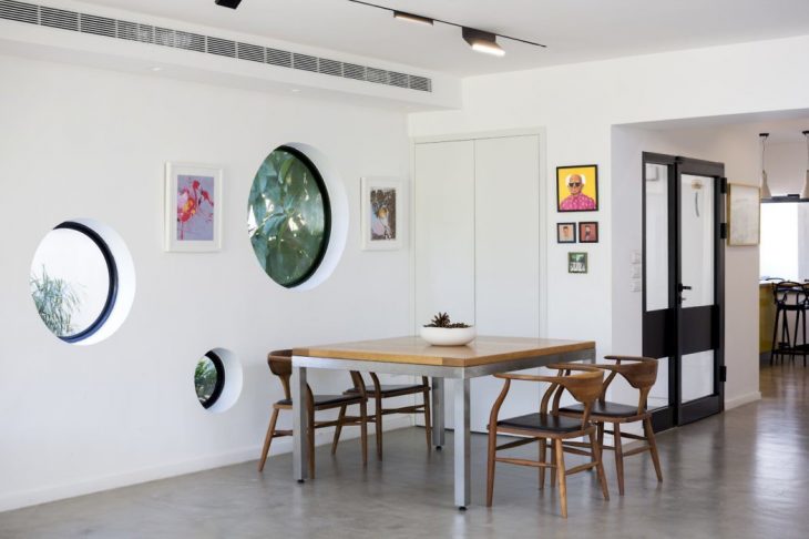 Three round windows in the dining area replace the previous long and narrow window, they add an interesting and playful composition to the space while allowing the greenery outside to peek through.
