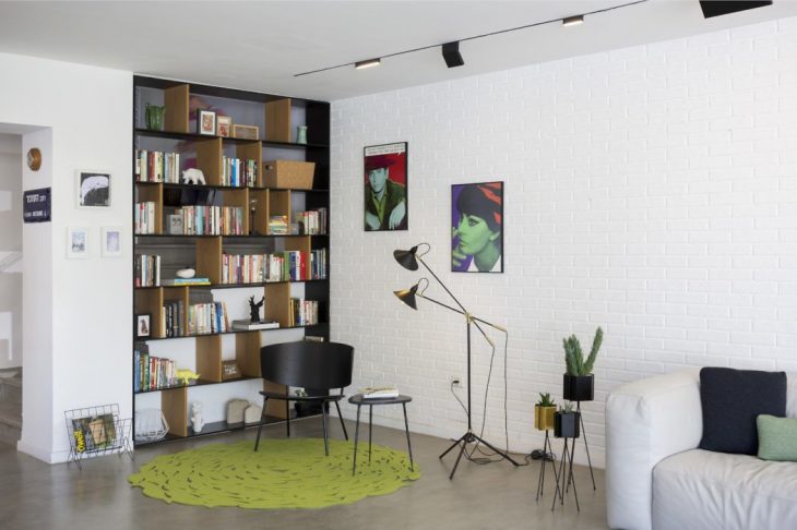 Inside, The asymmetrical ceiling was replanned in order to create a continuous space and add much needed lighting. The back wall in the living wall was covered with white bricks, that enrich the space with minimalistic texture, while covering up the uneven existing wall. The original floor tiles and staircase were covered in concrete microtopping and black lighting fixtures, matching the new aluminum window frames, were added.