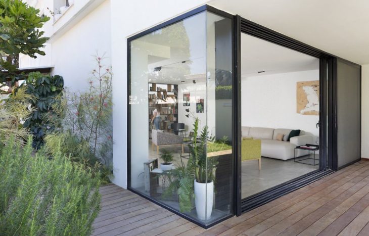 “The owners asked to keep the basic floor plan and to focus on creating a unique and creative space” says the designer. Before redesigning the interior, she replanned the entrance to the lot and the front yard, which was originally lower than the ground level of the house. Using a wooden deck, she managed to create a leveled platform to the yard, which is now on the same level as the living space, thus creating a spacious living area and for indoor and outdoor family time and entertaining. To maximize the link between the indoor and outdoor areas, she opened a large glass corner window in the front facade.