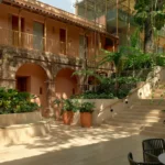 The entrance sits discreetly along the side of the main volume, accessible via a pathway lined with curated vegetation. Upon arrival, visitors step into a vestibule that leads to a central garden, offering an immediate connection to the outdoors.