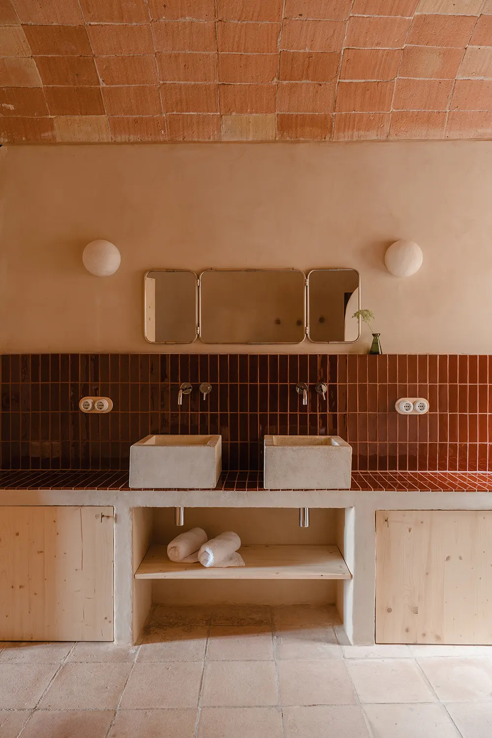 The project removes added finishes to reveal the original structure beneath. Walls return to lime mortars and plasters, allowing the masonry to breathe while introducing texture and light across surfaces. The restoration of handmade toba floors and artisanal tiles strengthens the connection to traditional building methods.