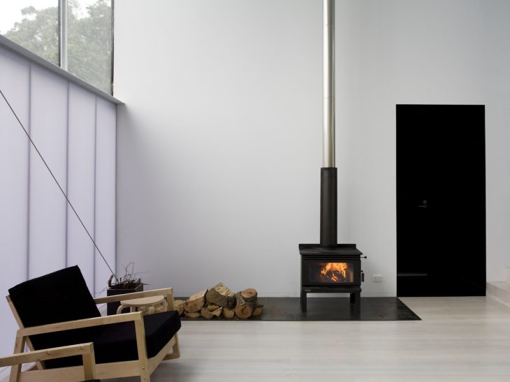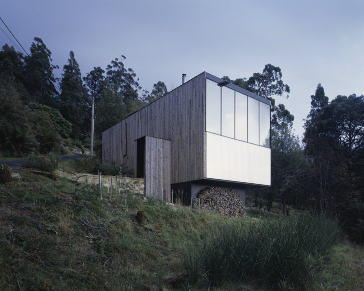 From the architects: The Little Big House is located upon the eastern slopes of Mount Wellington, high above Hobart. At 450 meters above sea level, set within a forested landscape, this house encounters snow in the winter months.The siting of the residence is mindful of its context; positioned close to and perpendicular to the curvilinear road. The house, on a vacant lot between established houses and gardens, is defensive and diagrammatic. Tucked carefully between cadastral constraints and a magnificent birch tree, the footprint has been kept deliberately small. The dwelling is stacked across two levels which step to accommodate the undulating terrain. It’s just a box. A clean volume with two exceptions; a service core and an entry air-lock.