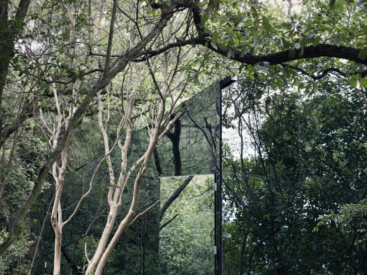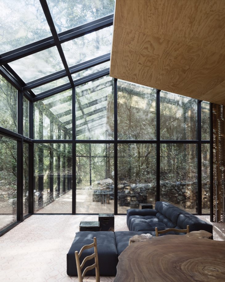 The landscape strategy aimed to respond and mimic the existing ora and fauna of the site in a designed aspect. The social area is on the rest level, within a mirrored glass envelope that simultaneously reflects and contains the lush surrounding; the main room overlooks the treetops; the other bedrooms are underground and built with clay and rammed earth in relation to the topography.
