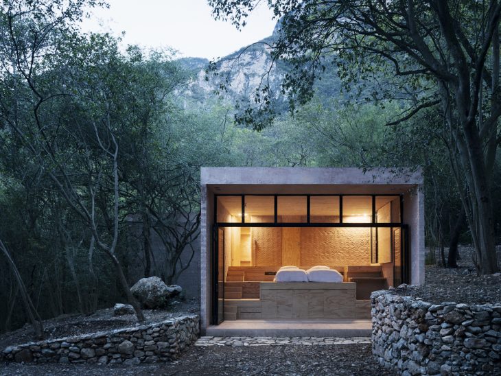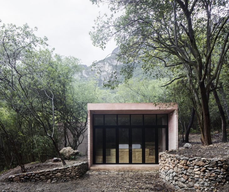 From the architects: The site of Los Terrenos is nearby Casa Ventura is located in a residential zone adjacent to the southwest side of Monterrey, it’s a highland forested zone. The housing program is fragmented according to each component’s function and role within the site, but they are all enclosed in a perfect square in the general plan. Each volume located in the corners, surrounding an organic shaped pool.