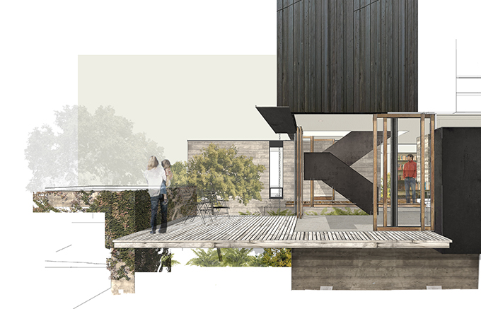 Beginning at the street, board-formed concrete volumes of varying heights are sited to form a se-quence of exterior and interior rooms which intertwine with the landscape. A wooden boardwalk slips over and through this series of spatial experiences to lead to the front door. Alongside it, a sunken landscape court slides into the house heightening the connection between garden and home. The primary living space opens broadly back onto the southwest facing court where wood framed glass doors allow the owners to live outside easily when the unpredictable Seattle weather allows. Floating above the courtyard level of living spaces and decks is a simple but bold black volume which creates cover below while encapsulating the private spaces of the home. Sliced Richlite panels are used to create an economical skin that catches the sun presents a unique texture to the street. A pivotal central stair of steel and charred fir bridges the upper and lower, inside and outside. The palette is simple and purposeful, infusing modern simplicity with warmth, craft, and detail.