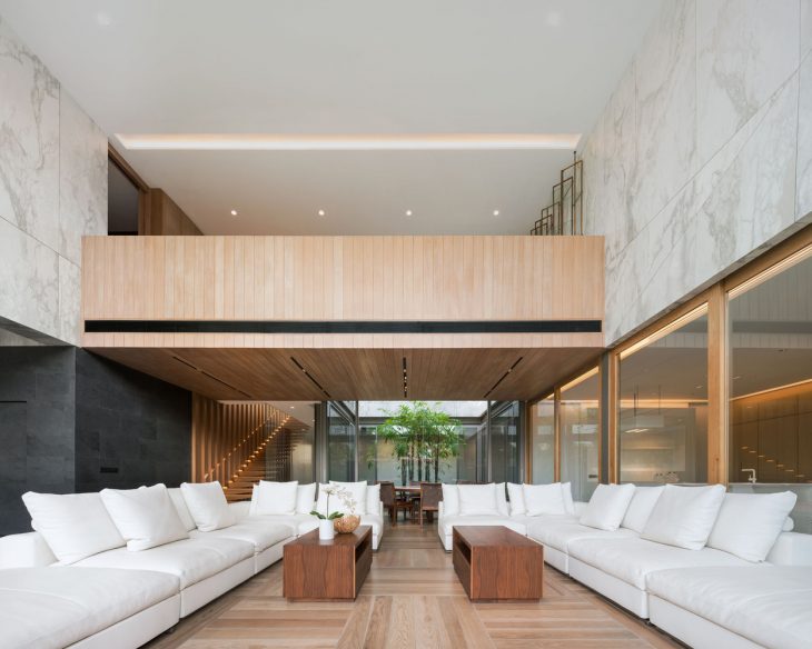 OPENBOX Architects designed this luxurious 1000m2 residence located in Bangkok, Thailand, in 2017. The residence is placed on one end of a rectangular land plot with a large Rain tree on the opposite end. A modern architecture style pavilion in the corner with a reflective swimming pool surface accentuates the appearance of the tree and create a memorable scene for the house. Take a look at the complete story after the jump.