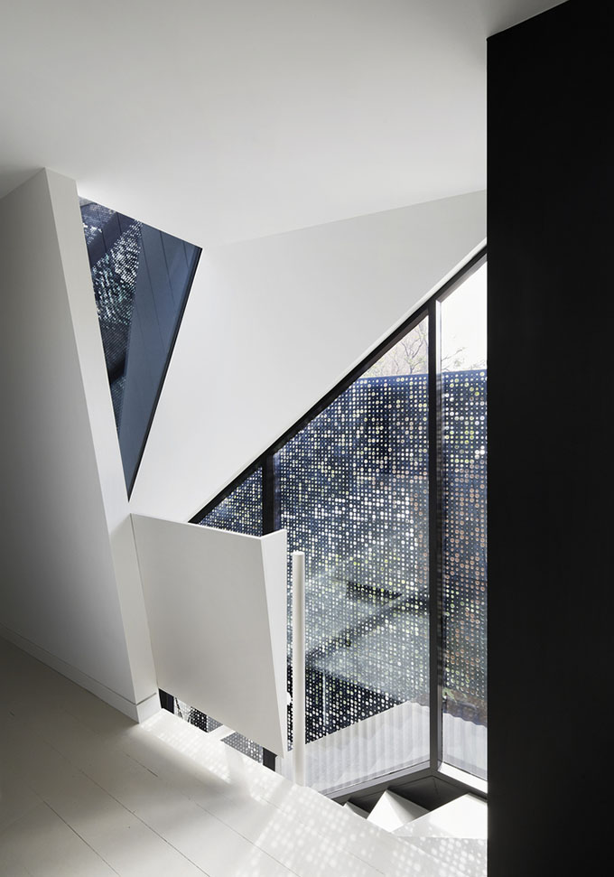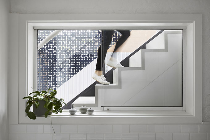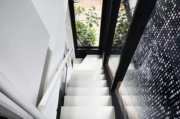 With limited available area, space was a premium, and to be used wisely. From the ground floor there is no indication of second level, maintaining the integrity of this humble brick floored workers-cottage. Upon closer inspection, four steps can be seen rising past the kitchen window giving a layer of interest and a process of discovery. Opening what appears to be a kitchen cupboard allows access to the light-filled stairwell and second floor, comprising a master bedroom, walk-in-robe, bathroom and second bedroom/study. The stair is intended as an external element and acts as a device to filter light through the middle of the building. It is screened to the east by perforated panels that create dappled light that flows over the stairwell and interior; like light through trees, changing with the time of day and the seasons.