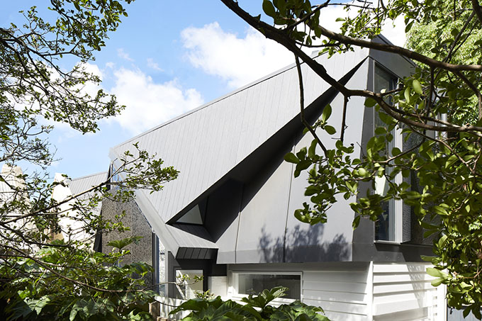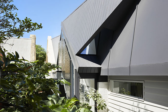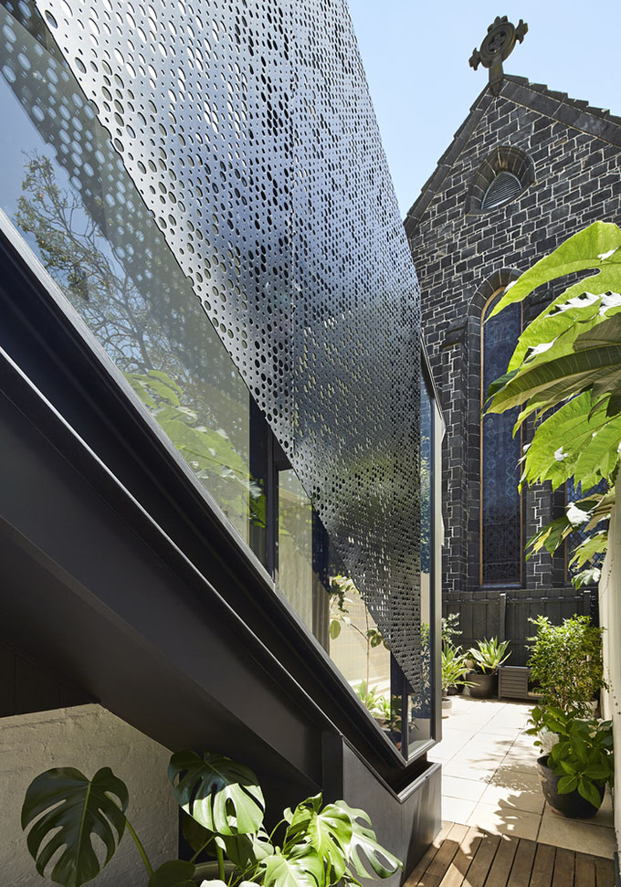 Views to the neighbouring church and its iconic features are framed throughout the dwelling by precisely positioned windows and skylights, creating a layered sense of connectivity. Framing specific focal points through the interior landscape, from both existing and new areas, informed the architectural design response. Operable glazing provides natural light and cross ventilation, while the angled volumes capture a beautiful, ever changing light quality.