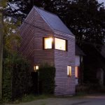 The screen panels are made of bronze anodized aluminum – water jet cut for a precise and patterned variable apertures, referencing the original home’s precast concrete window grilles. Although this is a contemporary design for the historic site, the building’s form and exterior materials match the historic home.
