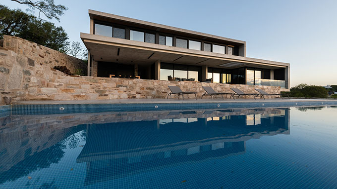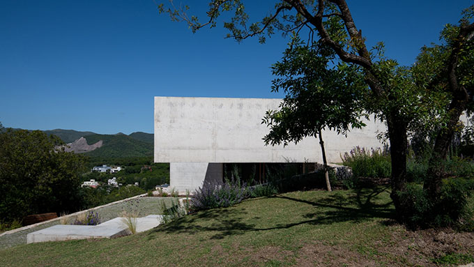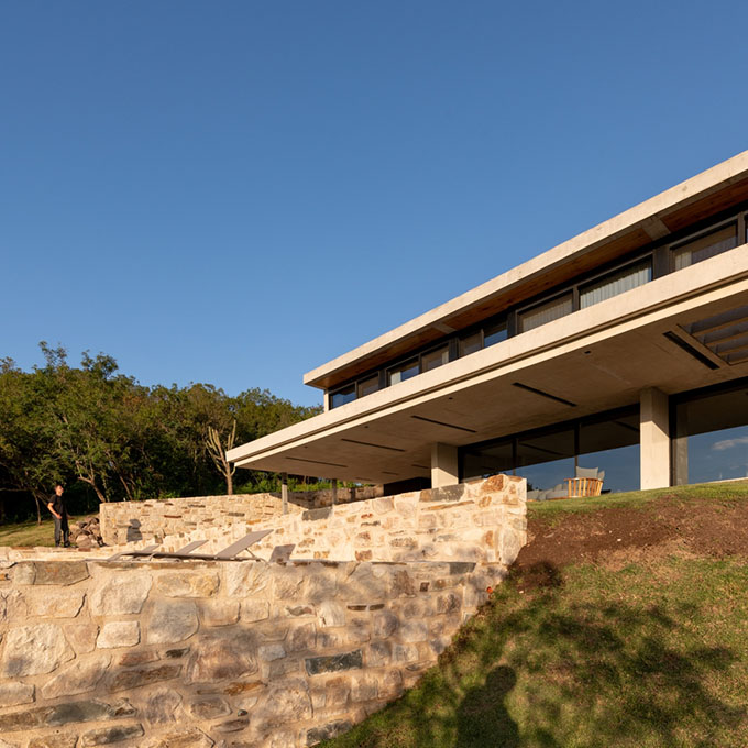 From the architects: The house is located within a privileged land with great views of the small mountains of the valley of Punilla. Located in a closed urbanization northwest of Cordoba in the town of Mendiolaza, has a rugged topography, with large differences which allowed us to play with two volumes that rest on each other and at the same time rest on the natural terrain and at times they are suspended in the air generating large overhangs that reinforce the idea of monolithic volumes. To achieve this we work with exposed concrete cast in situ, with phenolic formwork. This material is noble, classic, traditional and of low maintenance as well as the stone that was used to materialize the contentions of the terraforming and the basement of the house.