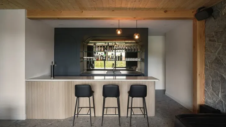 Inside, massive timber beams, red cedar ceilings, and stone walls create a warm, tactile atmosphere. The central fireplace becomes the anchor of the main living space, while the kitchen combines craftsmanship and intimacy with its built-in banquette and wall tapestry. A curved stone staircase leads to guest rooms on the lower level and to a bar area that opens directly onto the pool through retractable windows, transforming it into an open-air pavilion during summer months.