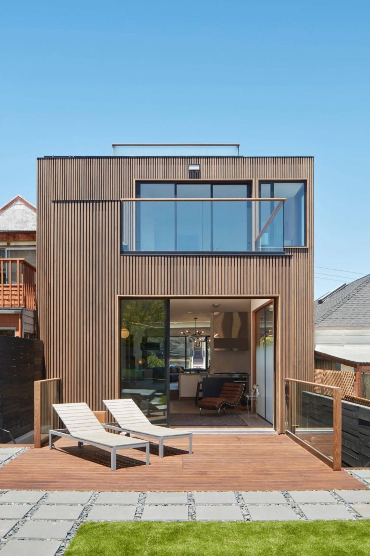 IwamotoScott designed this new ground-up house in the Noe Valley neighbourhood, as a speculative infill development for a builder in San Francisco whom we’ve worked together with on several projects. The site is located on a steep street, but has a fairly level topography within the lot, newly opened up by the demolition of a dilapidated small house at the rear of the property. The subtly-angled facade design was created by adapting to different setbacks of the neighboring houses, and as a response to the downhill views to the east. Exterior materials include both stained clear cedar vertical boards alternating with blackened spacer boards, aluminum windows with clear cedar casing, and cast-in-place concrete site work.