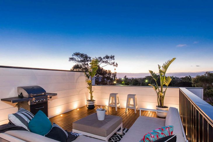 With the client being a builder a request was to push the boundaries of construction in timber framed homes and metal cladding. A 4m cantilevered black cube hangs over the entry creating a dominant display in the street with timber clad spotted gum wall over two levels to soften the darkness of the cladding. The timber cladding also incorporates a concealed garage door.?Split level design with light weight floor structures to the upper floor areas allows higher ceilings to core living areas without impeding on height requirements of the local council. A roof terrace built over the metal deck roof of the upper floor finishes the home and takes in breath taking views of the ocean and surrounding bushlands.