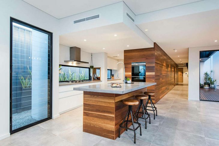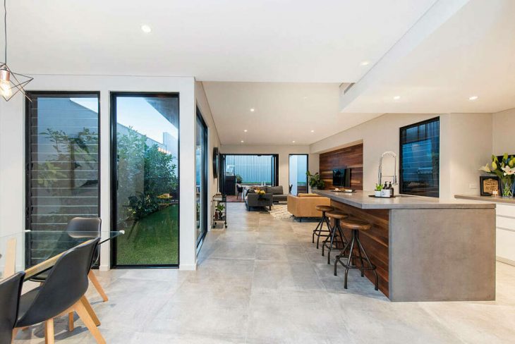 The homes space planning centres around using internal courtyards and landscaping, with big sections of glazed panels to add light and greenery to long passages and living rooms. This provides a sense of space and connection with external areas not normally common in skinny home designs. To enhance the use of natural light in the home a simplistic internal material pallet similar to a gallery space was used to bounce light around the home. White walls, concrete floors with pockets of timber to add warmth, visual connection with the external façade and acoustic treatments.