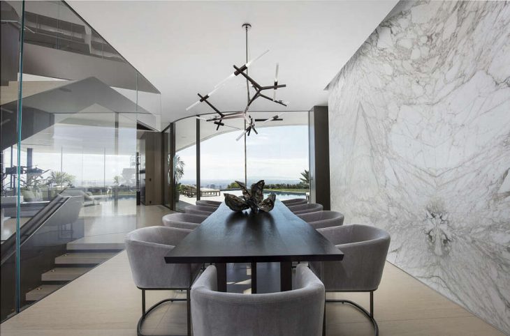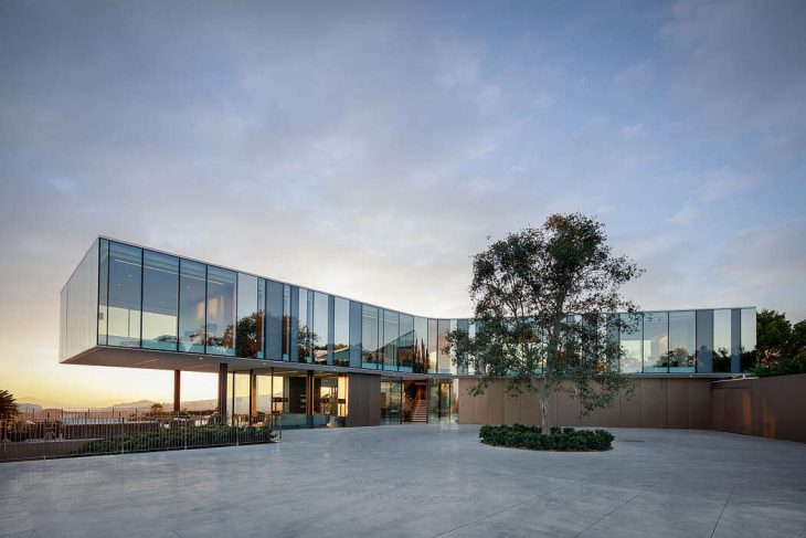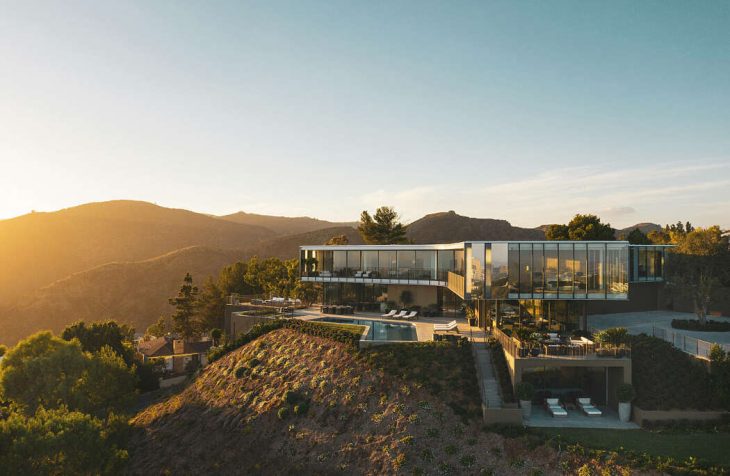 From the architects: Given its prominent positioning above a relatively developed neighborhood, the motivation behind the design of the home was to create a residence that could meld into its surroundings while maximizing views. The three-story structure, which takes on the shape of a three-winged propeller, is wrapped in glass that mirrors its sweeping views of the Los Angeles Basin, which are unobstructed from the Getty Center to Long Beach, Century City, and Downtown.