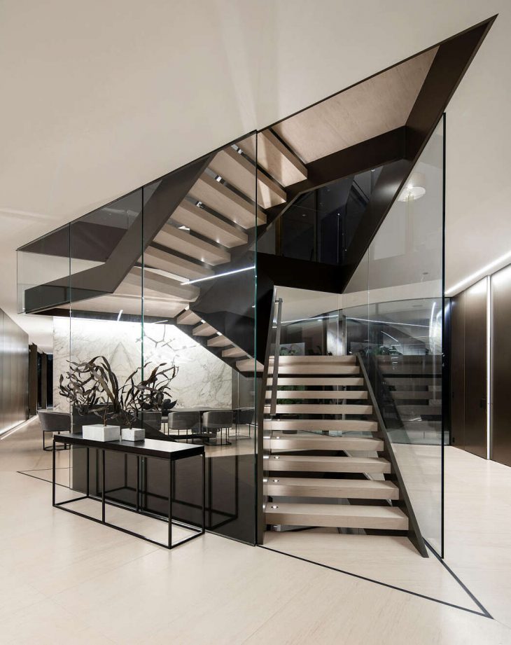 The outcome of the confluence—a dynamic glass and steel staircase stretching through the core of the structure—was in fact twofold: practically, it provided a very straightforward answer to the vast home’s circulation; visually, it joined what would otherwise be disparate areas in one’s line of sight.