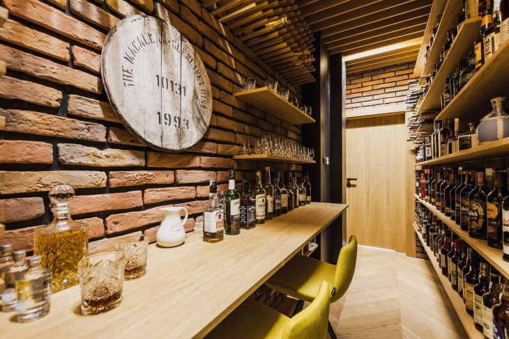 The architects have also planned an unusual wine cellar. The construction to store bottles consists of wooden pins placed between rows of bricks on the wall of the room. In a darkened room you can feel the taste of the selected beverage while at the same time admire all the available collection visually multiplied by the mirror at the end of the room.