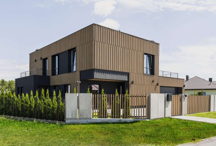 The facades have been covered with black plaster with cool pigments, and with protection against biological corrosion. A special solution designed by Metaforma is the use of an openwork composite joist system for black painted vertical lath and black cross beams. The wood-like composite we chose, instead of natural materials, does not require additional impregnation. All this creates an interesting three-dimensional effect. Dark details in the form of metal window casings and balustrades consistently complete the concept.