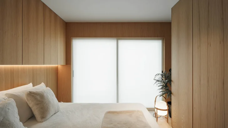 Inside, the design language is defined by an interplay of minimalist lines and tactile natural materials. Oak floors and wall panels, finished in soft beige hues reminiscent of sand, create a continuous visual flow. Light, neutral ceilings enhance the influx of natural light, intensifying the apartment’s openness and sense of calm. A sculptural element emerges in the form of a grey mirrored volume housing the sanitary facilities; this reflective surface blurs spatial boundaries, amplifying the perception of space and lending a sense of lightness and continuity throughout the home.