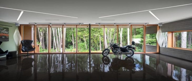 The client, a vintage car collector needed a room to store his gems in an integrated, and fully glazed attached car garage, which looks out onto the surrounding ravine.