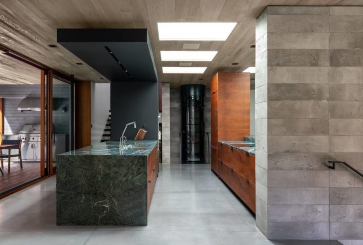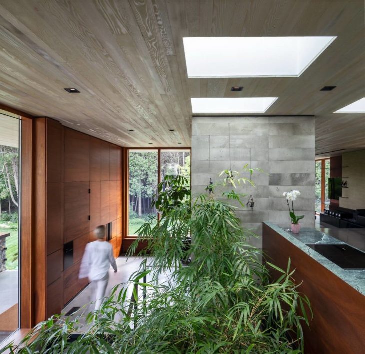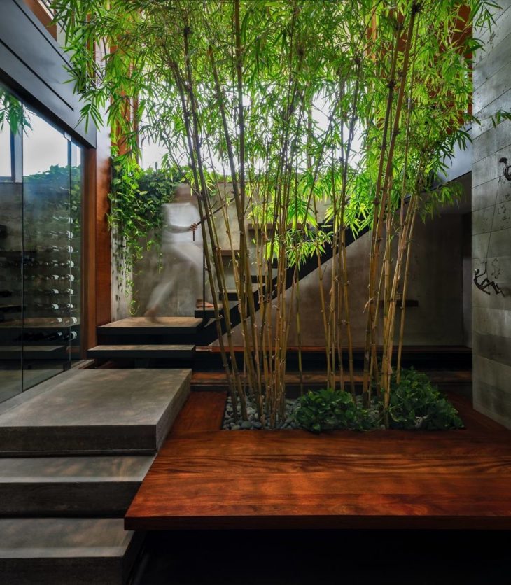 A double-height glazed atrium filled with bamboo trees at the entrance brings natural daylight into the lower level entertainment and recreation rooms. An elegant, open-riser concrete and steel stair accentuates this space, nestled between the tall vegetation and an indoor waterfall.
