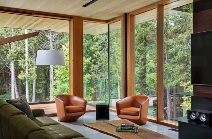 The main living space encompasses an open kitchen, with a dining room, and a screened porch which has the ability to merge with the interior or the outside of the dwelling.