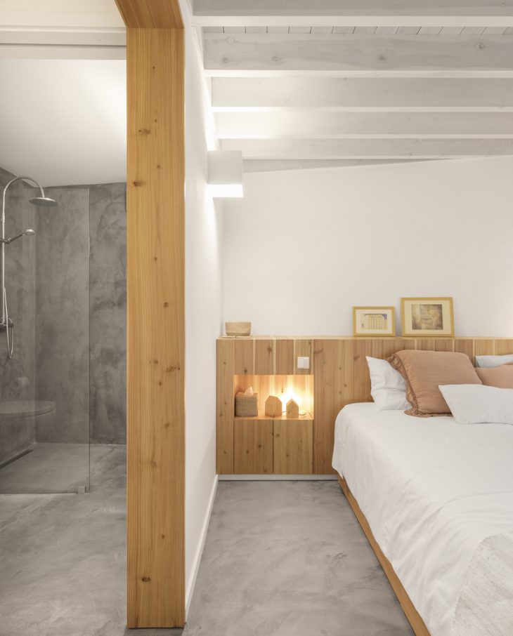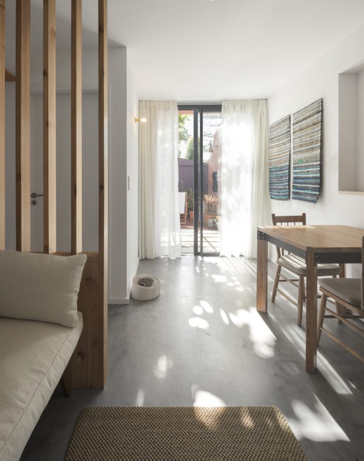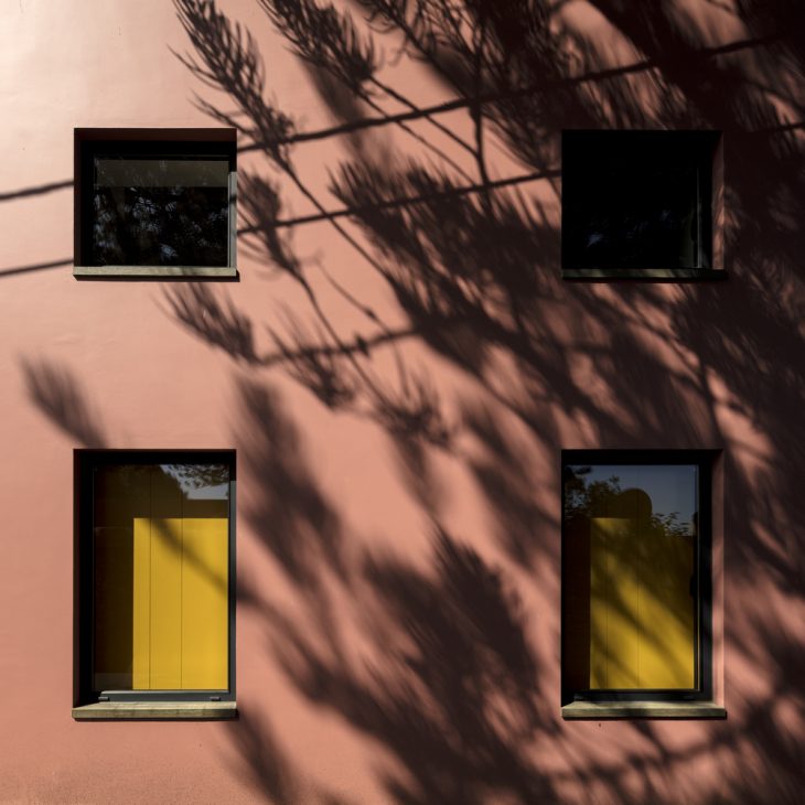 New elements, as the exterior stairs, connecting the outdoor terrace, or the use of whitened wood in the interiors, are re-interpretations of the Azorean vernacular architecture, which was important to dignify. The aged pink and ochre tones are the main identity of the area where the building sits. The ochre was traditionally used to frame windows and doors, at Pink House it was used instead on the bedrooms interior shades and kitchen, adding a new kind of relation between inside and outside views.