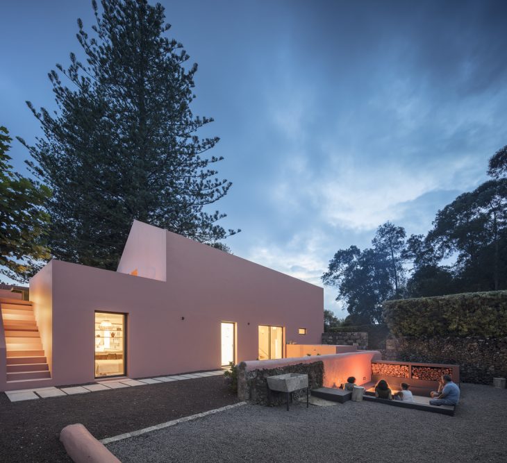From the architects: The design’s main goal was to keep the construction’s character, lines, and its rural atmosphere, while adapting the enclosed structure to a completely new typology and contemporary regulations. New openings where carefully shredded in the colored façades, as well as on the stone wall, and a new volume was added to the main construction, allowing for a second, smaller house to appear integrated in the whole.