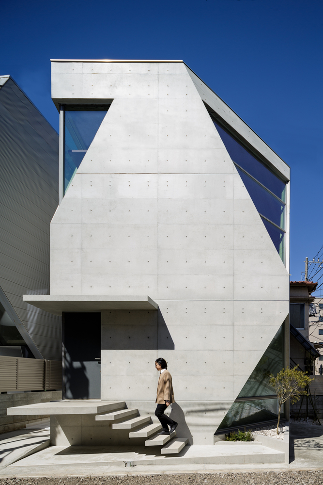 Transition from the planimetric cognition to the cross-sectional cogitation. For architecture on a small site, sectional and volumetric design becomes very important. A high level sound insulated audio visual room in the basement, and a spacious gallery and a Japanese room is placed on the first floor. Functionality was prioritized on the second floor with a living room, dining room, kitchen and bathroom. The living room is a very small space, but a 5m high ceiling and a large oblique triangular window, drawing in an abundance of external light, results in a cognition that is far greater than the reality. The final design of this space was derived through a vast number of three-dimensional models. Three design methods that achieve physical and psychological richness.