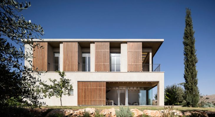 From the architects: Designed by Tel-Aviv based practice Golany Architects, the house overlooks the Sea of Galilee with a sweeping view of the Galilee from every room. The Generous openings facing the view to the south and east, require the provision of shading and filtering against the intense sun, which is provided by the wooden shutters. The shutters slide in adjustment to the position of the sun and privacy requirements.
