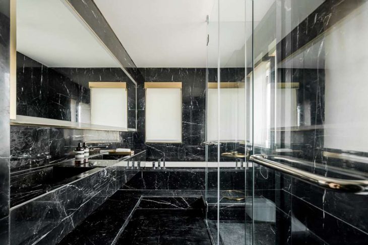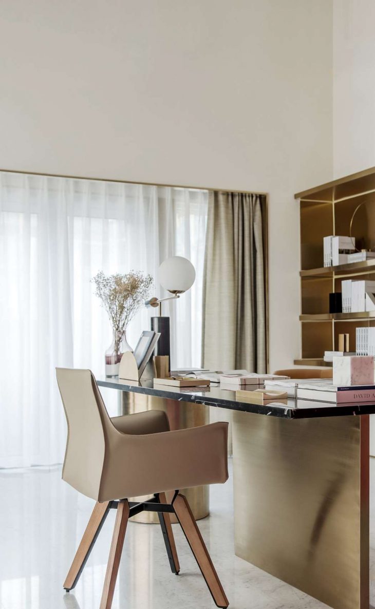 The same large-scale study room provides its owner with any possibility of using. Copper cabinets are embedded into the wall and integrated as bookcase. Similar technique is adopted in the ceiling and the living room, creating intermittent continuation with sculptural frames. Black stones wrap out every detail of the bathroom. Oversized mirror extends a sense of penetration, which enlarges the visual space and interprets inherent luxury of modern bathroom concept.