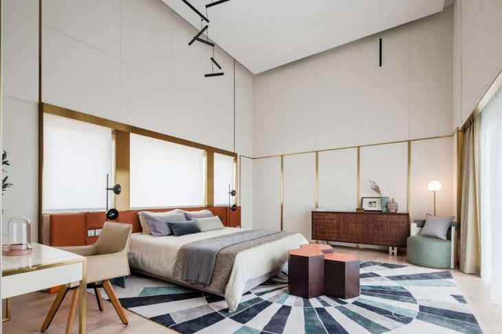 Red sets the tone in leisure room, running through furniture to artistic ornaments, which grab visitors’ eyes with exquisite edges and corners. Black marble & bronze side table and other dark-toned furniture are in balance with the red, realizing a perfect color-matching. On the second floor, oversized master bedroom allows a more diversified space combination, along with a new lifestyle. Horizontal dividing lines match the human scale. Materials in different depth of warm brown and orange enrich the space color. Divergent patterned carpet occupies a huge floor area with a cohesive centripetal force pointing to the bed, which adds a bit of stylish & artistic atmosphere.