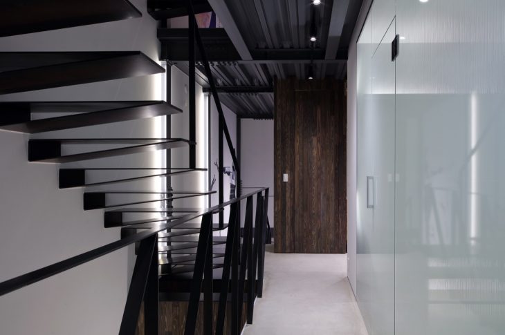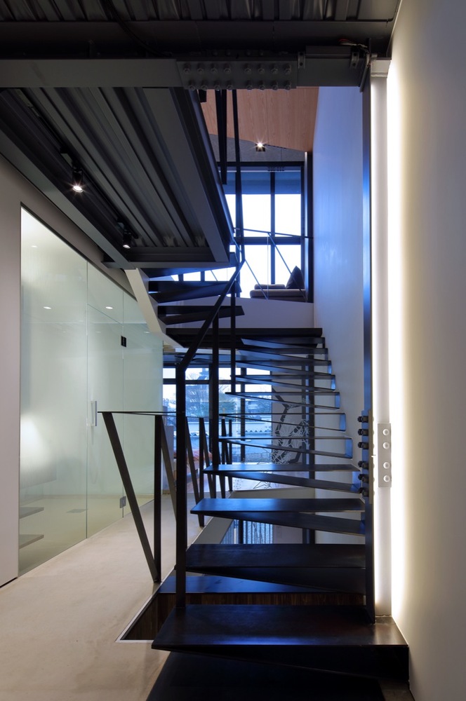 The first floor is mostly the guest area, the second floor has the main bedroom area and the third floor has the Living / Dining area in one large open volume with glazing at both ends. The glazed roof-hatch opens to the roof garden above…From the street there is a private courtyard behind the broad timber gates, landscaped with young and old trees. The fireproof timber siding has been stained individually to create an elegant but understated street facade, contrasted with the galvanized steel work.