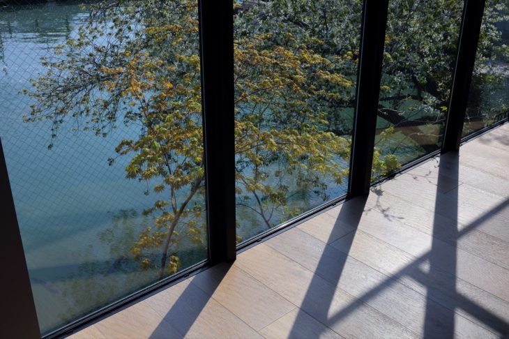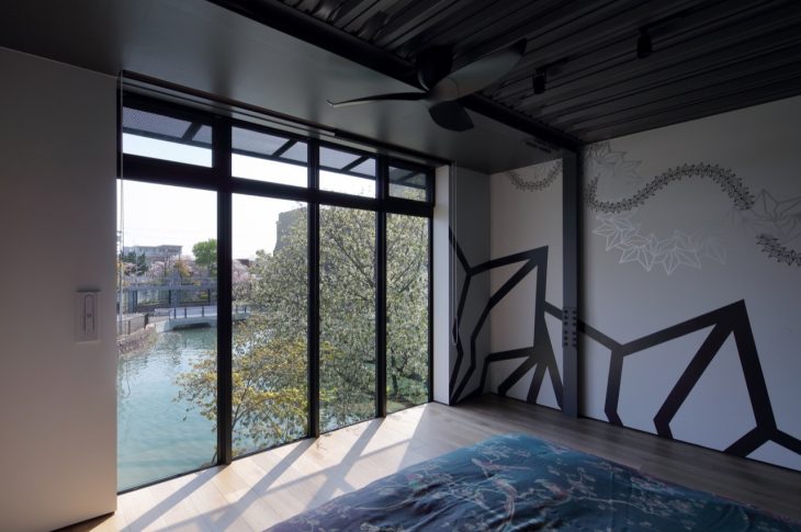 On a typically small site wedged between the road and the river this house in Kyoto is a kind of European canal-house in Japan. It is close to the city center but in a quiet street near cafes and restaurants, bakeries and a chocolatier. The museum district (with temples and shrines) is a short walk, and there are many cherry trees lining these streets.