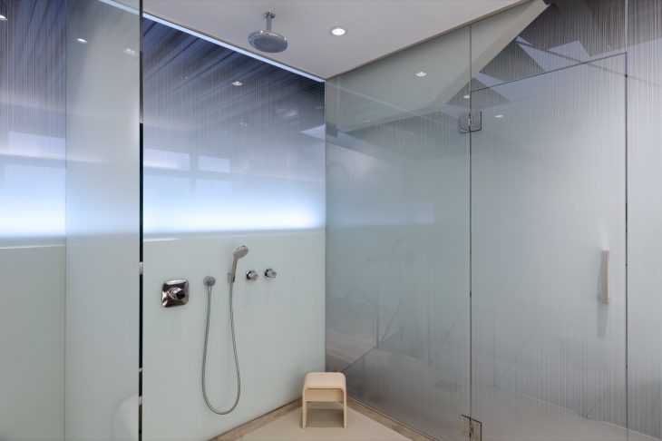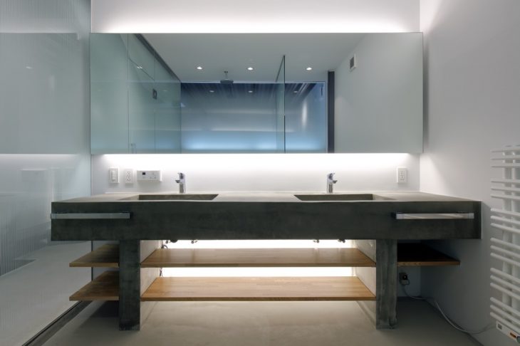 The interior is stripped back and low-maintenance, masculine. The ceilings are exposed steel form-work, the floors are exposed concrete as are the benches and basins. The stairs and handrails are raw steel. Standard elements of the ‘domestic cosmetic’ are absent. The bathrooms are glazed, and the North facade (facing the river) is all glass – privacy is not so sacred in this house. The art works are painted straight on the walls (and windows) by local artists commissioned directly by the client. They loved the idea of 21 st century cave drawings….This was a kind of turn-key project for the foreign clients, with the architects handling all the various details such as helping to select and buy the site, setting up accounts for utilities, buying white ware and furniture etc etc. (The clients actually said it was easier for them to build in Japan than in California…)