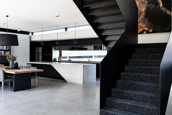 The minimal aesthetic of the interior acts as a gallery for the client’s art collection. The sculptural elements of the steel stair and concrete kitchen bench engage in conversation. The use of mass materials to form detailed interior objects contrasts to the external form that is singularly defined by light repetitive elements.