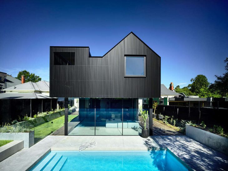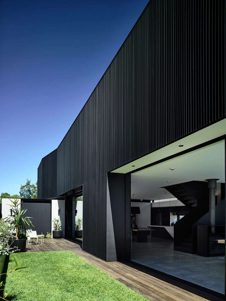 The gable running the length of the house tapers in scale and peels away from the southern boundary to ensure sunlight is maintained to the neighbour. The reduced scale sees a house like silhouette floating in the backyard over the living spaces below. The long northern aspect is carefully designed with passive solar principles and the rear garden is cut into the land creating a deep courtyard and in turn managing the afternoon sun. The house is powered by a photovoltaic installation. There is ample insulation and the house is shaded by the skin of battens, overcoming the thermal issues around a black house.