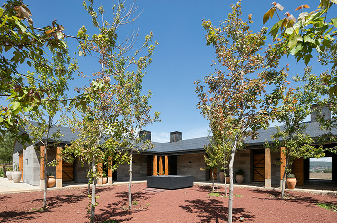 The central patio plays a major role in the development of Rancho San Francisco. Apart from integrating both spaces, it creates a new area within itself for leisure. A grid of oaks that will embellish the landscape as they grow, surrounds it.