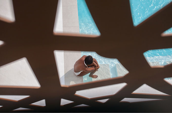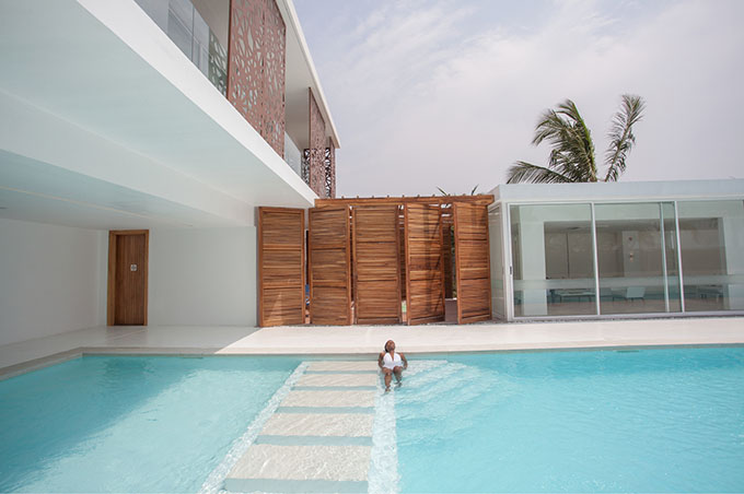 Our architectural intent was to create a series of spaces that could work for multiple gathering niches and more communal spaces for entertaining. The pool, 21meters long plays a focal role, reflecting beau- tifully the colour of the sky. Majority of the building materials were locally sourced, particularly the cedar wood for the tongue and groove doors and rotating shutter panels for the hot tub area. White concrete was used for the pool deck to avoid the monotony of a tiled surface and polished concrete was used for all internal spaces. Frame-less glass was used for the balustrade behind the steel laser cut screens to emphasis the elegance of the screens.