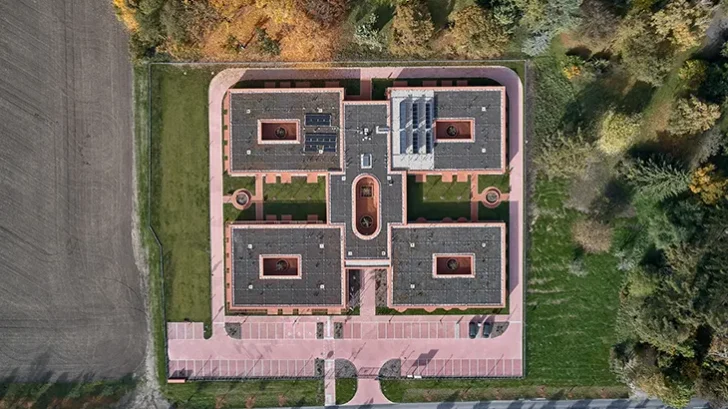 On the edge of Nový Bydžov, a quiet Czech town defined by orchards, brick walls, and open horizons, a new Senior Citizens’ Home introduces an architectural response grounded in dignity, landscape, and community. Commissioned by the Town of Nový Bydžov and built on the site of a former orchard near the local hospital, the project replaces conventional institutional models with a spatial concept rooted in domestic scale and autonomy. Designed by Architektura as a fully barrier-free, single-story complex for approximately sixty residents, the building reframes senior living through light, gardens, and the archetypal presence of brick.