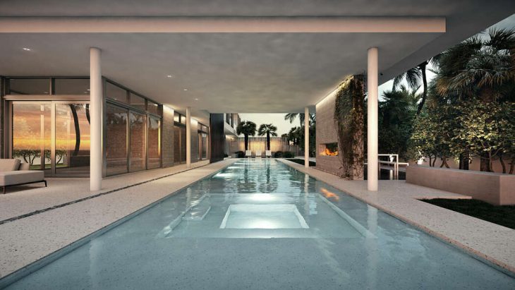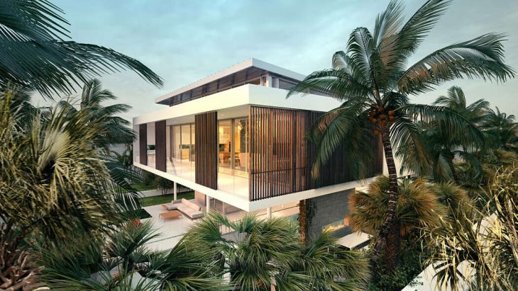 With the lift of the structure above base flood elevation as a zoning requirement, the Owners’ aspiration was to inhabit modest but carefully interconnected pavilions that levitate above the tropical landscape. The simplicity of form is achieved through the configuration of the L-shaped structure that is composed of two rectilinear pavilions. Containing the public aspects of the program as well as the Owners’ quarters, the main pavilion is carefully carved out to open itself toward the water views of Big Sarasota Pass. This uninterrupted view becomes the common datum that links the spaces of the open floor plan and the adjacent rooms. Separated from the main pavilion by a transparent two-story entry stair, the private elements of the program are gathered in a long and narrow volume. The orientation of the guest pavilion takes advantage of the internal courtyard containing a tropical garden with lap pool while also providing additional water views. The cantilevered extension of this volume above the private courtyard entry screen enhances the essence of the floating structure as if it was reaching out to capture the views of Bayou Louise on the opposite side of the property.