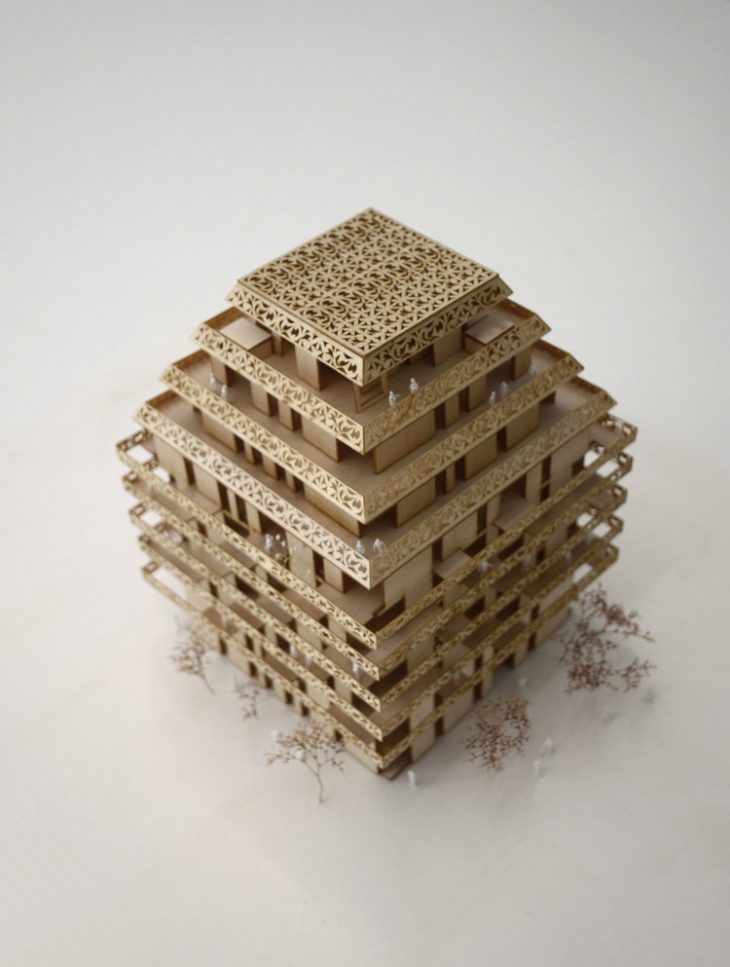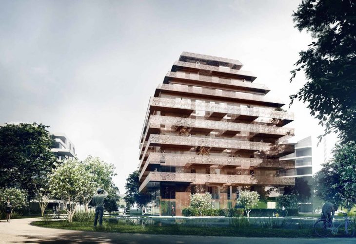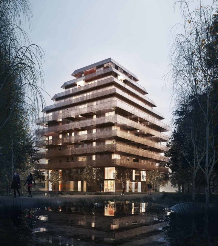 Developed for Solon Eiendom, the copper housing complex consists of 50 apartments with generous openings and private exterior spaces. The play of the tower geometry allows all apartments generous ceiling heights and sheltered terraces. Ski Vest Reiulf Ramstad Arkitekter’s tower is wrapped by linear copper terraces with a characteristic pattern giving the project a unique language.