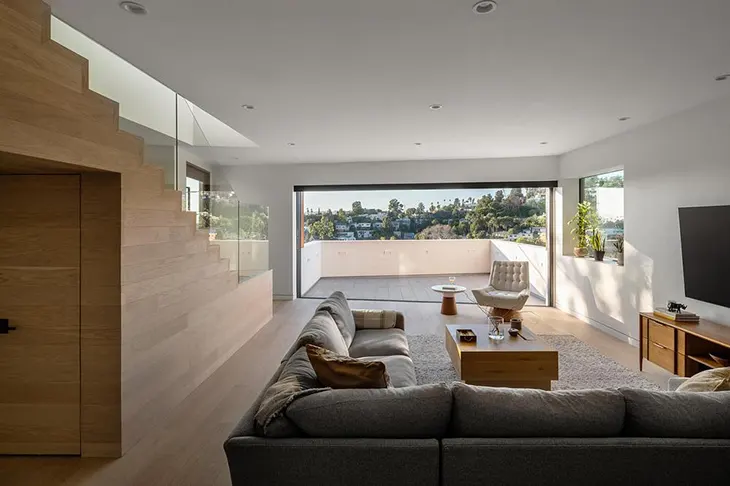 Aaron Neubert Architects completes Slot House, a 2,400-square-foot residence positioned on a steep up-slope site in Los Angeles. Overlooking the Silver Lake hills and reservoir, the project approaches the terrain as a constraint that defines both form and sequence, resulting in a tightly stacked volume that integrates directly into the hillside.