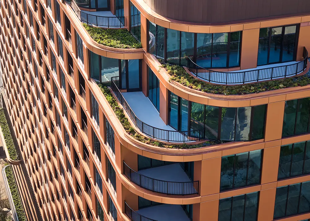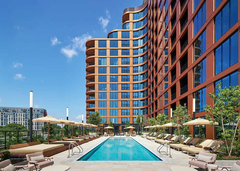 Inside the tower, Stella houses 327 residences ranging from studios to penthouses. The interior program mirrors the scale and ambition of the exterior, offering amenities developed to support both private living and social activity. Residents enter through a hotel-style lobby and gain access to a rooftop pool and lounge, fitness facilities and a screening room. The mix of spaces reflects a residential model designed for daily life and long-term engagement with the building.