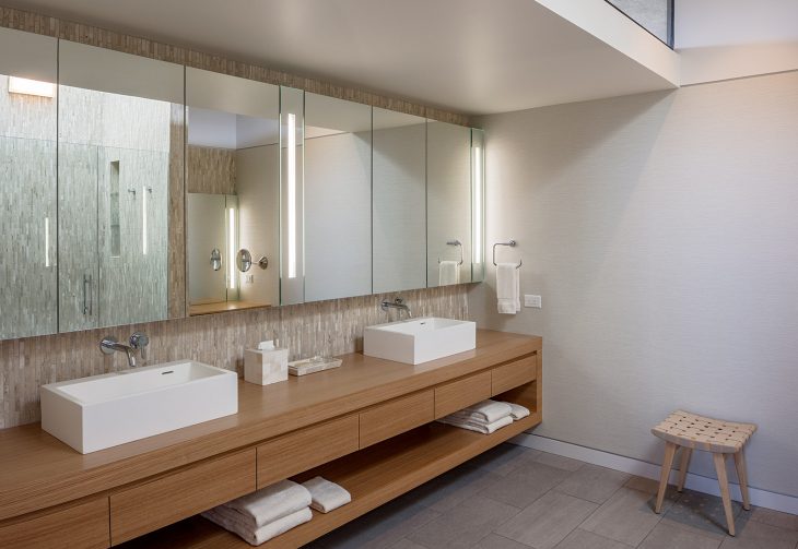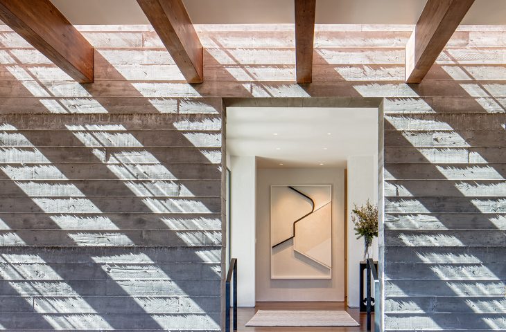 This ridgetop house in Santa Fe is organized around two perpendicular board-formed concrete walls. The walls are an element of continuity, linking interior and exterior spaces and the landscape beyond. A narrow skylight runs the entire 125’ length of one of the walls, casting changing shadows on the rough concrete over the span of the day.