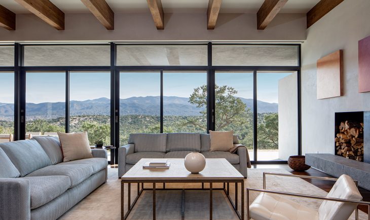 The front of the house is set deeply into the earth. You enter through a recessed courtyard and into a cool, private vestibule. An opening cut into one of the concrete walls then leads you into the main body of the house, where panoramic views of the Sangre de Christos mountains are revealed. Although there are large expanses of glass, they are all deeply shaded by cantilevered roof forms that create porches around the perimeter.
