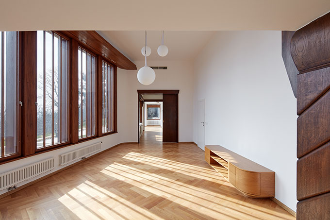 As was mentioned before, the oak windows of various sizes and shapes are one of the house’s characteristic features. Architect Grégr designed the shapes with regard not only to the interior and its’ views of the landscape, but also to the meticulous composition of the exterior mass. New windows are an exact copy of the original ones, including their surface finish. The metal fittings were restored and used again. The craftsman working on the windows spent over a year at the site, since he had to transport the windows to his workshop one at the time to ensure that the new ones were a truly exact copy.