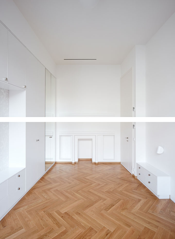 A super-elevated living room equipped with a hearth and piano space is in the heart of the house. It mirrors to the façade by its high double wing windows. Connected to the living room are a dining area and a former library that now serves as a bedroom. All the living premises are serviced from the hallway adjacent to the northern façade. Therefore the inhabitants would not be disturbed by personnel. Three bedrooms are located on the first floor. A new gentleman bathroom, that was originally not part of the solution, was supplemented. Very important was the new basement solution. The basement was previously uninhabitable due to severe dampness. Now it was dehumidified, it is possible to use the underground premises as full-fledged part of the house and thus two dressing rooms, utility and technical rooms and personnel background were established here.