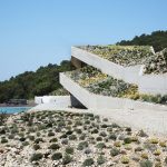The new upper level features large frameless glass windows and is filled with light. The interior was opened up to create double-height spaces that bring this light from above and into the center of the house. The new composition is one which is clearly of its time, but also respects and reflects the time and place in which the original house was created. The house is on a site that straddles a fault in the limestone base strata below. Water continuously flows up through this fault and flows out onto the property. The original 1955 house featured a foundation with extremely deep concrete piers that allowed the house to bear on more stable strata far below the surface. Given that building new piers was cost-prohibitive, we did not expand the house’s footprint at all, but cantilevered the new second level out from the existing structure. This strategy not only allowed for the house to be within budget, but also gave it a distinctive dynamic expression. The different materials and profiles of the first and second floors emphasize the house’s horizontality and create another kind stratum that is visual and expressive. Inside the house, a double-height entry hall features stairs that lead up to the second-level main living space. The perimeter of this space is made up of frameless glass is set atop a continuous planter wall that provides a green foreground to the treescape beyond. Large overhangs provide shade at all times of the day, and the surrounding cladding of charred cypress prevents glare and adds a textural counterpoint. Other features include a large kitchen with countertop-height serving windows that open out onto a pool terrace and entertaining area, as well as unique built-in storage and display elements. Landscaping is entirely comprised of native grasses and other low-maintenance plantings.