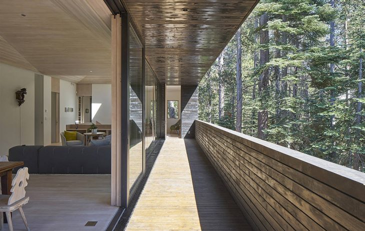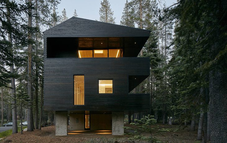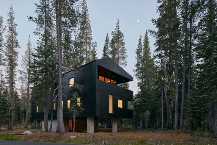 From the architects: Troll Hus is a 3,300sf single-family residence in Norden, California driven both by the extreme environmental conditions found at a 6,800 foot elevation and a California sensibility of generous indoor-outdoor living. Based on the alpine chalet building type, the house is lifted on concrete legs to protect it from snow in excess of 800 inches a year. The building’s orientation shields it from prevailing winds while allowing living spaces to open onto glazed south-facing balconies, maximizing solar exposure in the winter and shading the interior in the summer. The main living space at the upper level has an open plan configuration below two vaulted ceilings capped with skylights, demarcating two smaller spaces more akin in scale to an alpine cabin. The building is clad in pine tar-treated wood—the same natural, robust cladding found on 1000 year old Norwegian barns—which allows Troll Hus to recede within the canopy of surrounding pines.